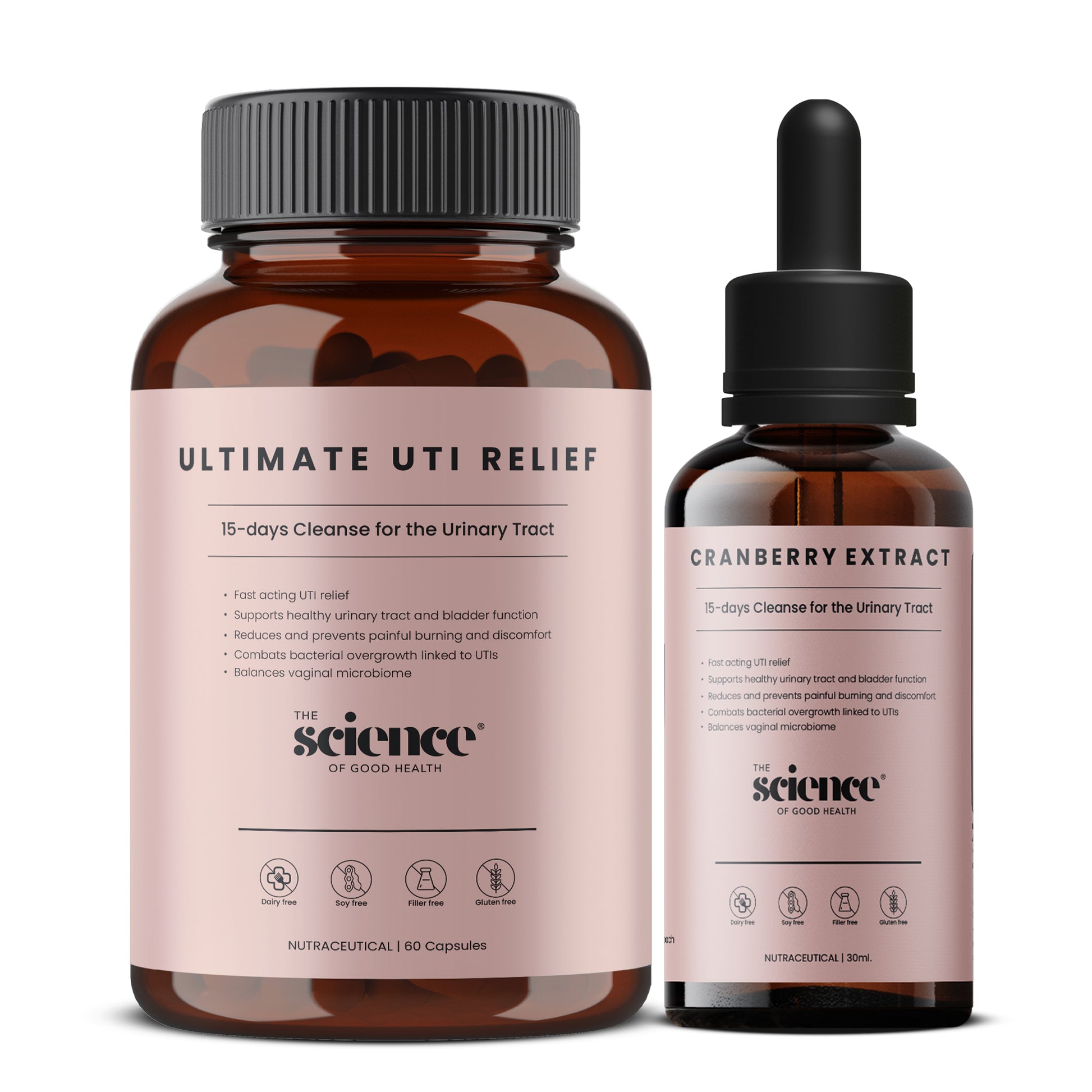 Dual-action kit combining UTI relief capsules + liquid cranberry drops for comprehensive urinary tract support.