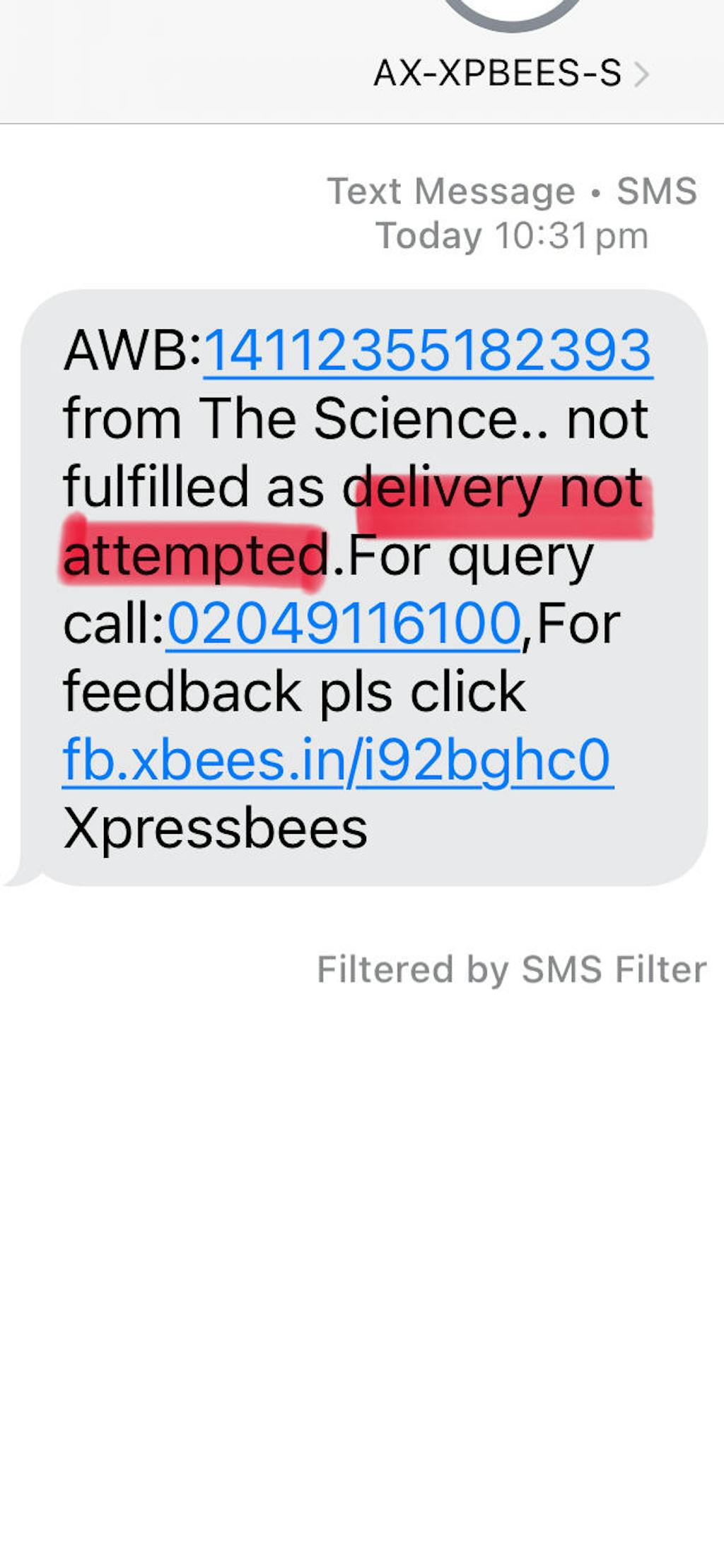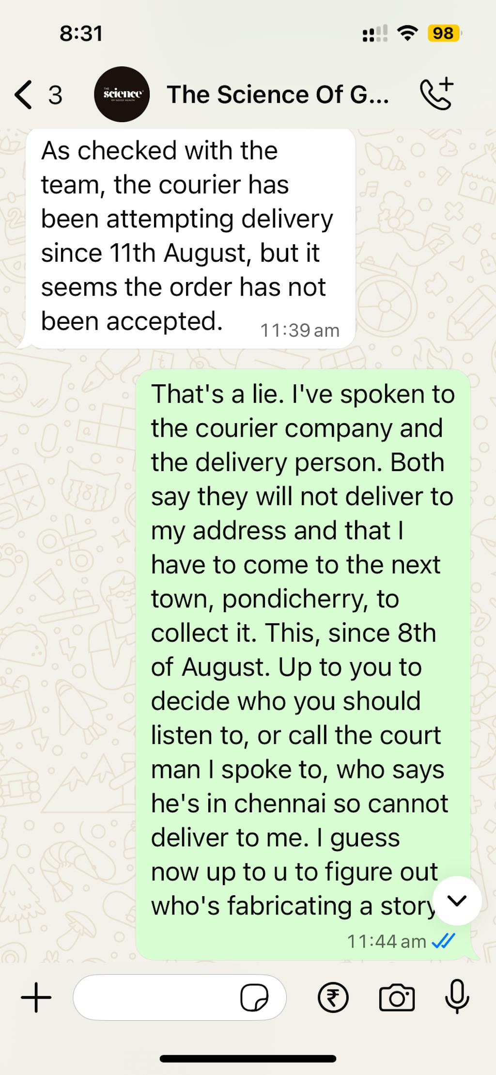 Also, every day I receive an SMS from the company as well as from the delivery person. The company says it is on the way for delivery, the delivery person messages that delivery was not possible.