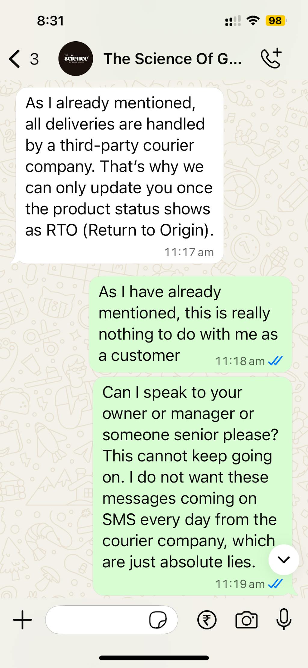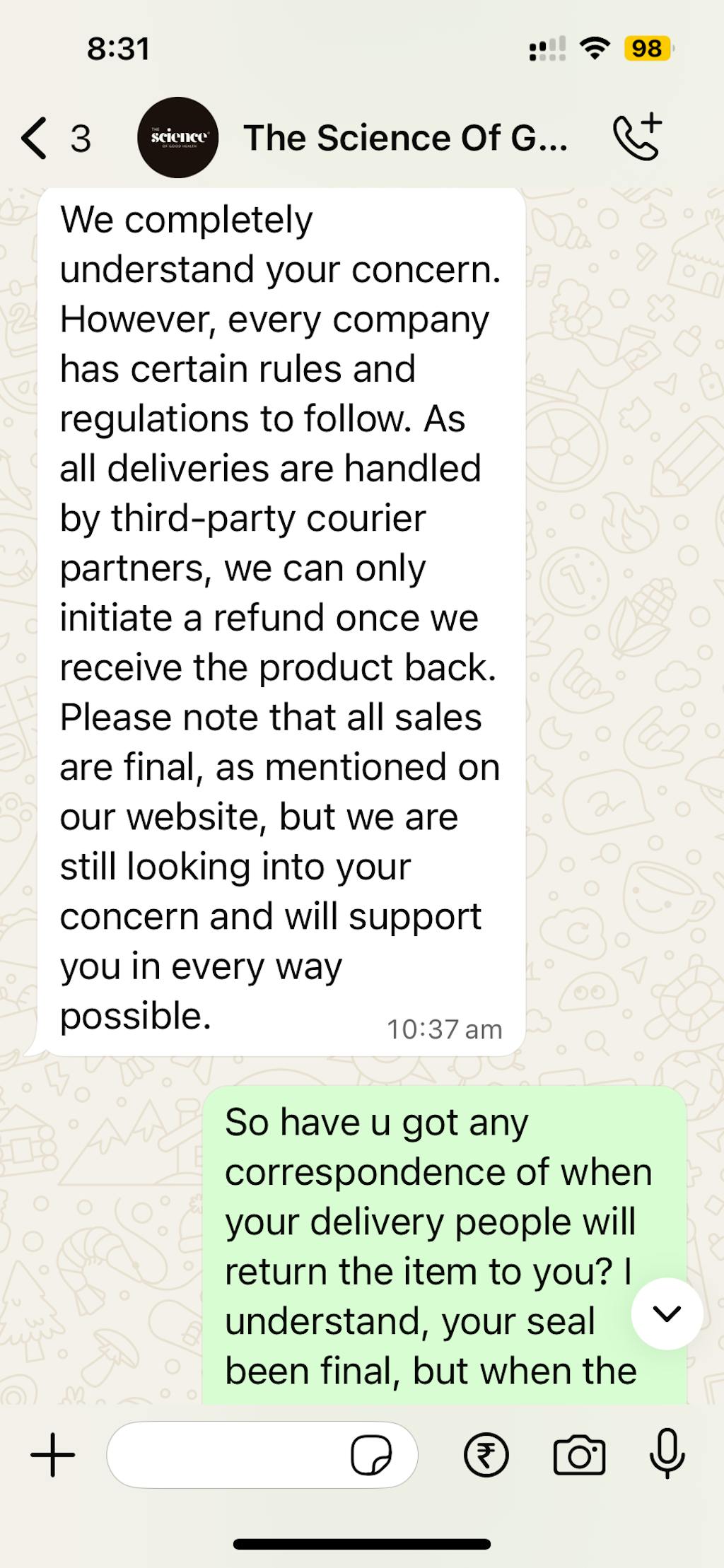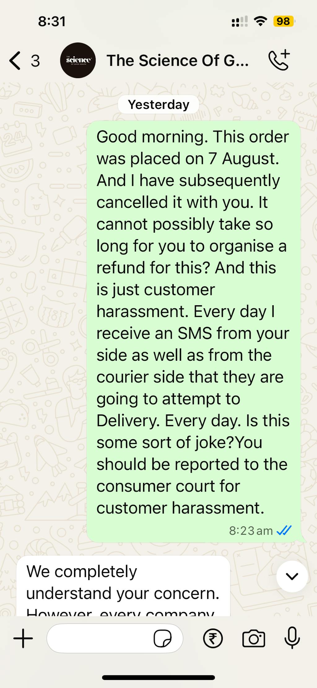 There is someone communicating with me on WhatsApp for days now telling me that she cannot make this decision to cancel the order and issue a refund, and this correspondence goes on and on every day.