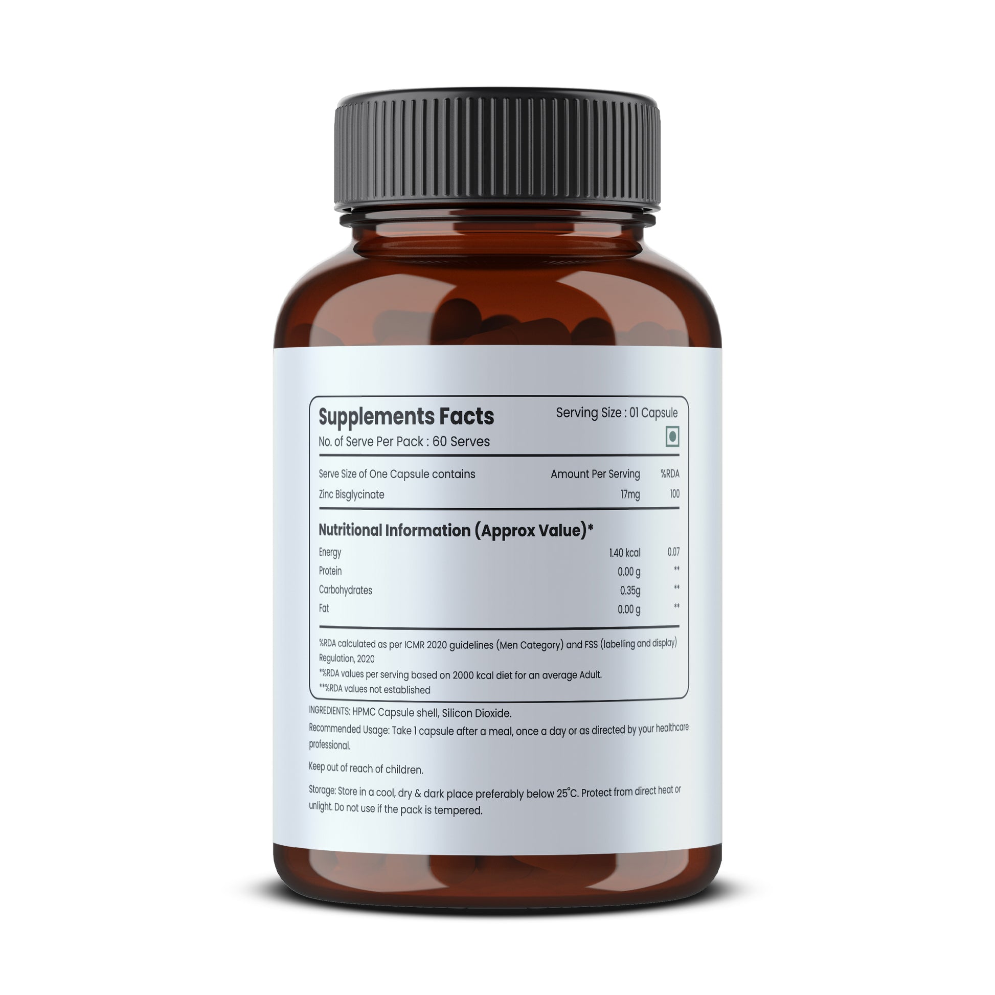 Each bottle contains 60 capsules of premium-quality zinc support for daily health and vitality.